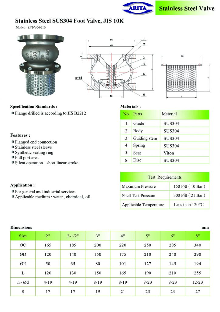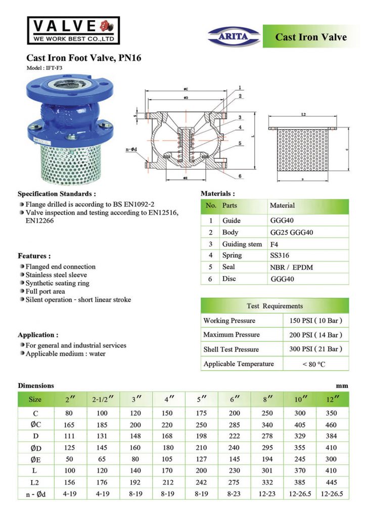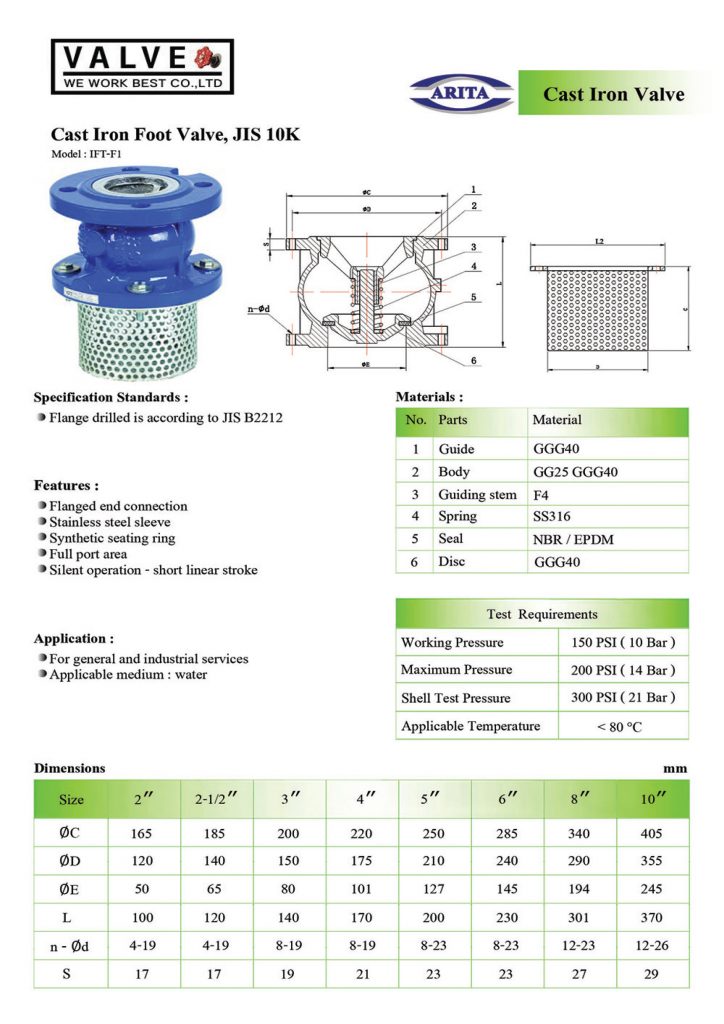 การติดตั้ง FOOT VALVE ติดตั้งอย่างไร >> สามารถติดตั้งได้ทุกแนว ไม่ว่าจะเป็นแนวตั้ง แนวนอน หรือแนวทะแยงเนื่องจากใช้สปริงในการควบคุมทุกทางการไหล อุณหภูมิใช้งานสูงสุดถึง 110c