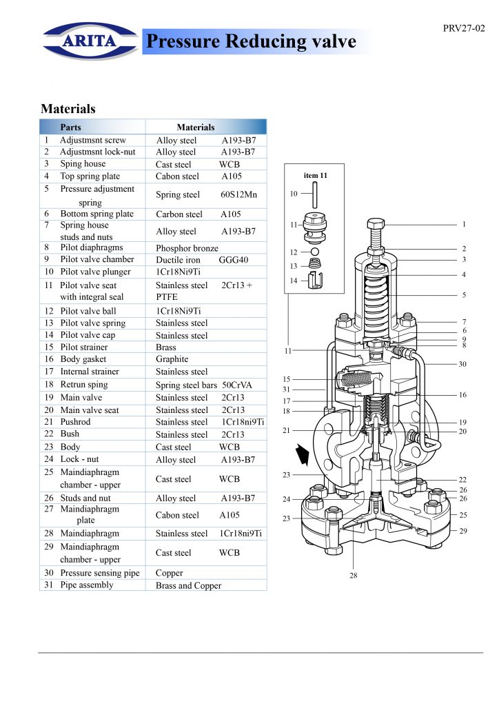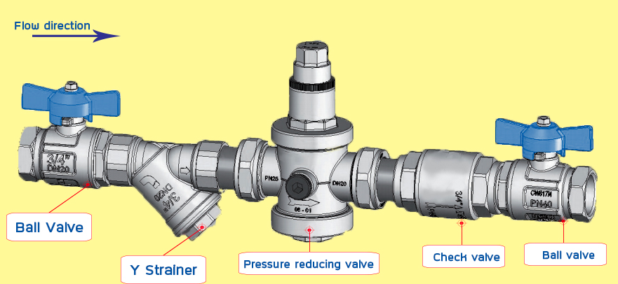 Pressure reducing valve (วาล์วลดแรงดัน)ทำหน้าที่ลดแรงดันวัดแรงดันที่ด้านขาออกจากวาล์ว หน้าที่ของวาล์วคือการปรับแรงดันให้คงที่ตามค่าที่ตั้งไว้หากแรงดันเพิ่มขึ้นทางด้านขาออกของวาล์ว วาล์วจะปิด เมื่อแรงดันลดลงที่ด้านขาออกของวาล์ว วาล์วจะเปิดเพื่อรักษาความดันให้คงที่