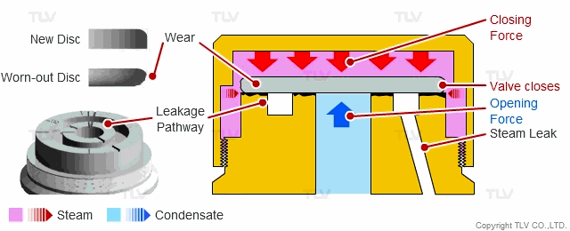 หลักการทำงานคือ ดิสก์จะยกตัวขึ้นเมื่อน้ำหมด ไอน้ำจะไหลผ่านแทน แต่เนื่องจากความหนาแน่นของไอน้ำน้อยกว่าน้ำทำให้ความเร็วไอที่วิ่งผ่านใต้แผ่นดิสก์มากขึ้นส่งผลให้แรงดันลดลง ดิสก์จะตกลงมาปิดวาล์วไอน้ำบางส่วนจะเคลื่อนที่ขึ้นมาที่ด้านบนของดิสก์เมื่อวาลปิดสนิทแรงดันไอที่อยู่ด้านบนจะดันดิสก์ปิดป้องกันไอน้ำออกมาเมื่อไอน้ำด้านบนเย็นตัวลงกลายเป็นน้ำปริมาตรลดลงทำให้ดิสก์ยกตัวขึ้นน้ำคอนเดนเซทจะไหลออกได้อีกครั้งหนึ่ง การที่ดิสก์ลอยขึ้นขนานกับหน้าวาล์วได้ เนื่องจากรูระบายออกมี3รูทำให้เกิดการสมดุล ถ้ารูระบายเกิดตันอาจทำให้ดิสก์ยกขึ้นลงไม่ขนานเกิดการติดขัดไม่สามารถปิดวาล์วได้สนิท