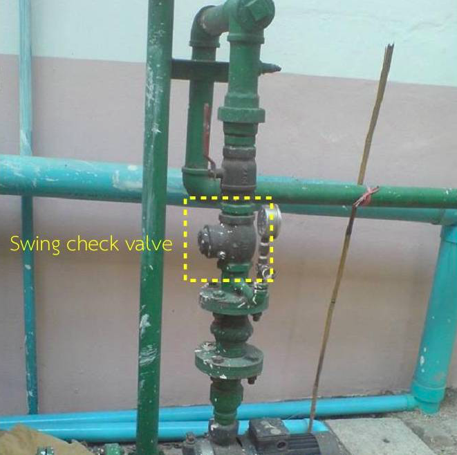 ที่นี้ลองมาดูตัวอย่างการติดตั้งที่ได้ไปถ่ายรูปมา รูปที่ ๓ เป็นการติดตั้ง swing check valve ทางท่อด้านขาออกของปั๊มในส่วนที่น้ำไหลจากล่างขึ้นบน จุดสังเกตที่ทำให้รู้ว่าวาล์วตัวนั้นเป็นชนิด swing check valve คือมันมีหัวนอตตัวเล็ก ๆ ที่ทำหน้าที่เป็นส่วนของแกนบานพับปรากฏให้เห็นข้างตัววาล์ว ระบบวาล์วตัวนี้ไม่มีปัญหาอะไร