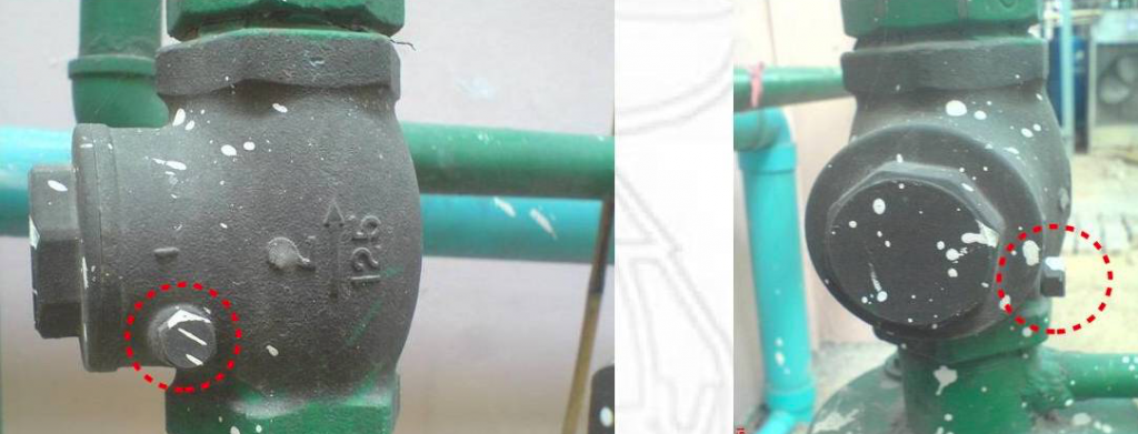รูปที่ ๓ ตัวอย่างการติดตั้ง swing check valve เข้ากับท่อด้านขาออกปั๊มซึ่งเป็นท่อในแนวดิ่ง ในกรณีนี้เป็นการไหลจากล่างขึ้นบน ที่วงแดงเอาไว้คือหัวนอตที่เป็นส่วนหนึ่งของแกนหมุนของ disc ทำให้บอกให้รู้ว่าเป็นชนิด swing check valve
