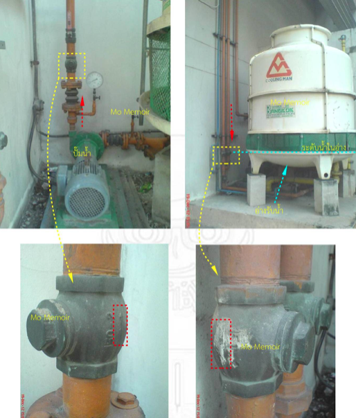ที่ทำให้ผมแปลกใจคือระบบ piping ของ cooling tower อีกตัวหนึ่ง พบว่ามีการติดตั้ง lift check valve อยู่ด้วยกันสามตัว ตัวแรกเป็นวาล์วด้านขาออกจาก cooling tower โดยปั๊มสูบน้ำเย็นที่อยู่ในอ่างที่อยู่ด้านล่างเพื่อส่งออกไปใช้เป็นน้ำระบายความร้อน (รูปที่ ๔ ด้านซ้ายบนและซ้ายล่าง) โดยในกรณีนี้เป็นการไหลจากล่างขึ้นบน (ตามลูกศรสีแดง) ซึ่งผมเองก็ไม่เข้าใจว่าทำไปถึงเลือกติดตั้งวาล์วชนิด lift check valve ในแนวดิ่ง ในกรณีนี้คิดว่าการใช้ swing check valve น่าจะดีกว่า