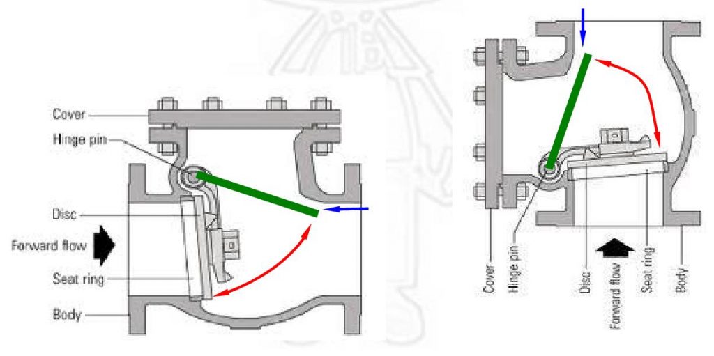 รูปที่ ๑ Swing check valve รูปซ้ายเป็นการไหลจากซ้ายไปขวา (รูปจาก http://www.spiraxsarco.com) ตัว disc จะเปิดตัวขึ้นตามลูกศรสีแดง (ไปอยู่ที่ตำแหน่งเส้นสีเขียว โดยไม่ขนานไปกับทิศทางการไหล) ถ้ามีการไหลย้อนกลับจากขวามาซ้าย แรงดันจากการไหล (ลูกศรสีน้ำเงิน) ก็จะดันให้ตัว disc ตกกลับมาอยู่ที่ตำแหน่งปิด วาล์วชนิดนี้ติดตั้งในแนวดิ่งได้ แต่ต้องเป็นการไหลจากล่างขึ้นบน (รูปขวา) การติตตั้งเข้ากับท่อในแนวราบก็ห้ามติดตั้งกลับหัวหรือวางเอียง เพราะจำเป็นต้องใช้แรงดึงดูดของโลกในการทำให้ตัว disc ปิดเวลาที่มีการไหลย้อนกลับ และที่บอกว่าตัว disc ต้องไม่เปิดจนขนานไปกับทิศทางการไหลก็เพราะถ้าตัว disc เปิดจนขนานกับทิศทางการไหลและนำไปติดตั้งในแนวดิ่ง เมื่อเกิดการไหลย้อนกลับจะไม่มีแรงดันให้ตัว disc ปิดตัวลงมา