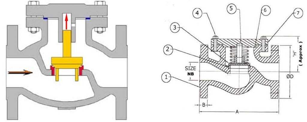 รูปที่ ๒ Lift check valve (รูปจากhttp://www.flosteer.com/checkvalves.htm) วาล์วตัวซ้ายเป็นชนิดไม่มีสปริงช่วยกด plug แรงต้านการเปิดจะต่ำ (ตามน้ำหนักของตัว plug) แต่ใช้ได้สำหรับการติดตั้งเข้ากับท่อในแนวราบเท่านั้น ห้ามกลับหัวหรือวางเอียงด้วย ตามรูปเมื่อมีของไหลไหลจากซ้ายไปขวา ของไหลนั้นจะดันตัว plug (หรือ disc) ให้ยกตัวขึ้น (ตามลูกศรสีแดง) และเปิดช่องให้ของไหลไหลผ่านไปได้ แต่ถ้าเป็นการไหลกลับทางจากขวามาซ้าย ตัว plug จะถูกของไหลร่วมกับแรงโน้มถ่วงของโลกกดให้ตัว plub ตกลงมาปิดรูการไหล ส่วนตัวขวาเป็นชนิดที่มีสปริงช่วยกด plug (ตามแรงสปริง) (รูปจากhttp://www.dalsonsvalves.com/lcv.htm) รูปแบบหลังนี้จะมีแรงต้านทานการเปิดที่สูงกว่าแบบแรก บางคนก็บอกว่าแบบที่มีสปริงช่วยนี้สามารถติดตั้งในท่อแนวดิ่งได้ แต่ตัวผมเองไม่มั่นใจว่าจะไว้วางใจได้สักเท่าใด