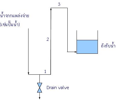 รูปที่ ๕ ในกรณีนี้ drain valve อยู่ที่ระดับต่ำกว่าระดับผิวบนสุดของน้ำในถังรับน้ำ ดังนั้นถ้า drain valve เปิดออกจะทำให้น้ำระบายออกทางวาล์วตัวนี้ และน้ำในถังรับน้ำจะไหลย้อนขึ้นสูงก่อนที่จะไหลออกทาง drain valve ได้เนื่องจากเกิดปรากฏการณ์ “กาลักน้ำ – siphon”